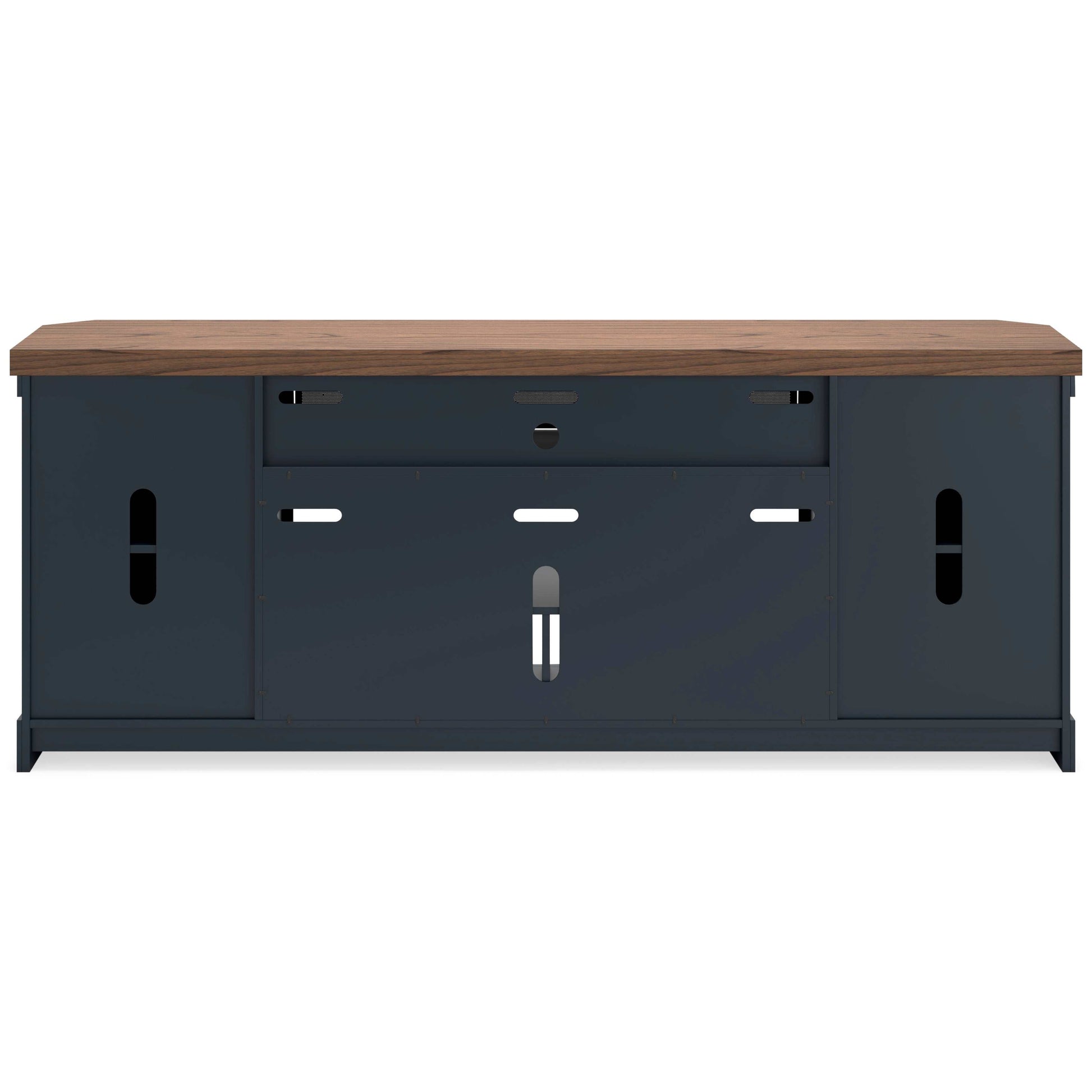 This TV stand combines casual contemporary design with modern appeal. Its combination of a thick-bodied wood-tone top with a slate blue cabinet is a smart choice on so many levels. Stow away electronics in the roomy cabinets, and use the upper shelf to conceal a soundbar speaker for a clean integrated look. Enhancing the experience: the optional fireplace insert (sold separately) brings a touch of warmth and beautiful ambiance to your living room.
