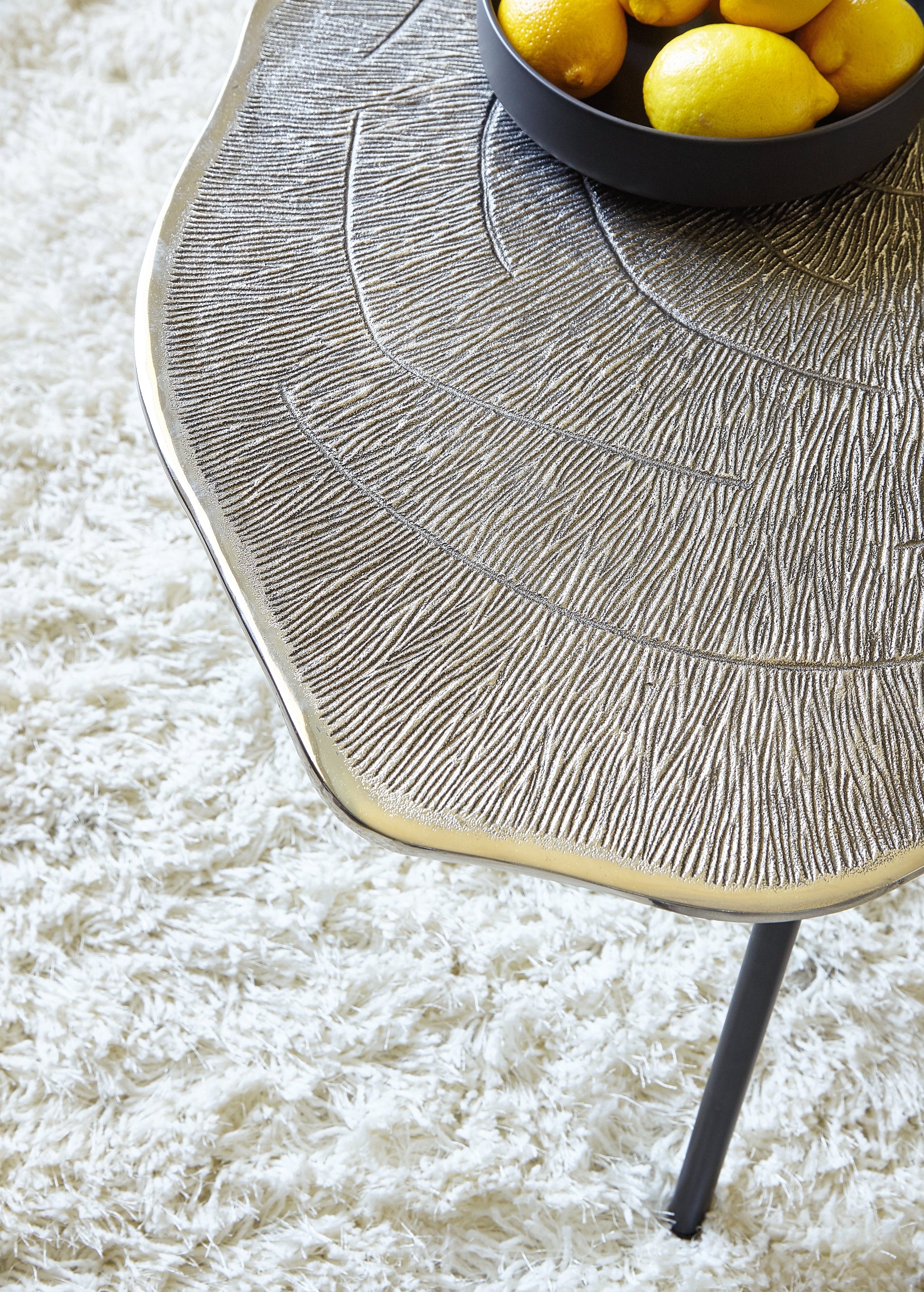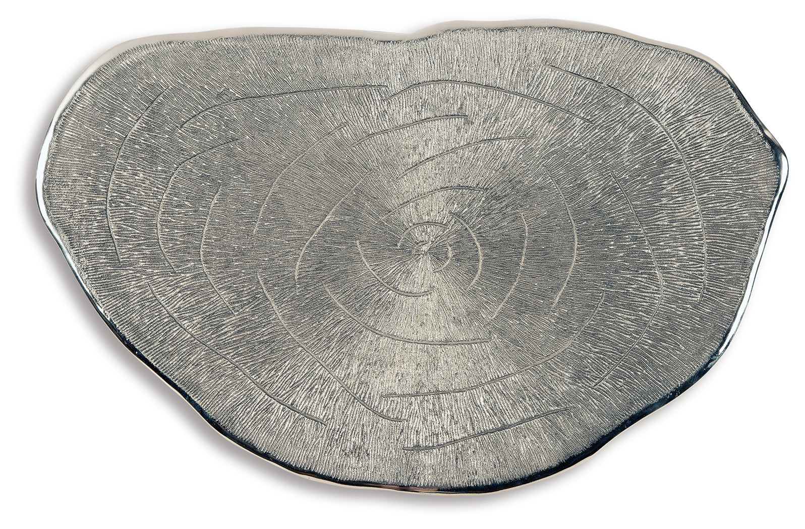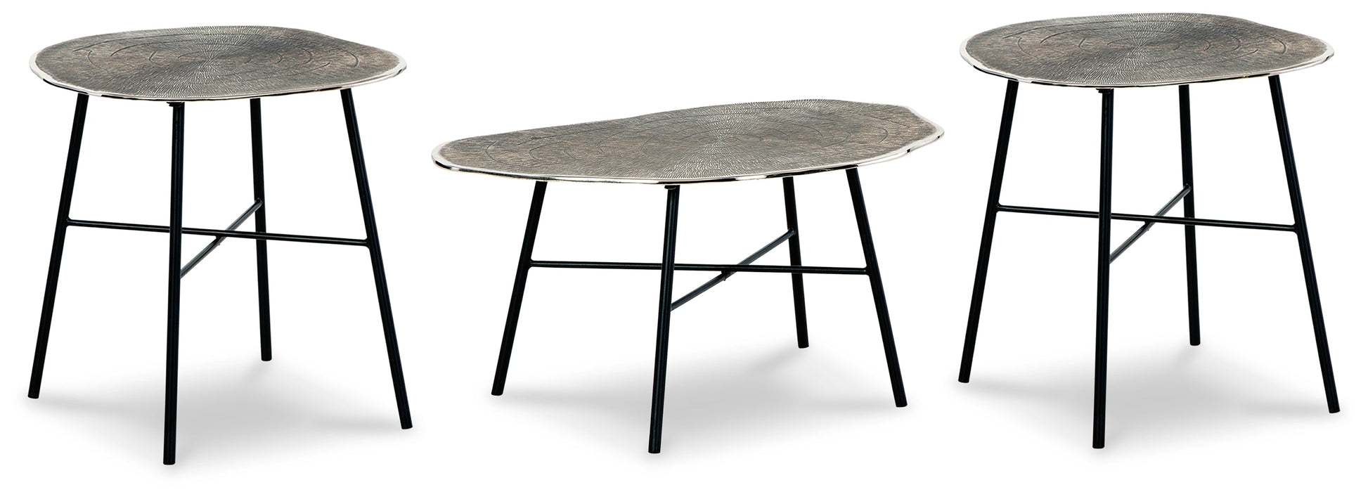 Rich with curated character, this coffee table puts a contemporary spin on natural beauty. Its irregular grooved top is refined with the glamour of a gleaming chrome-tone finish. A black base completes this cool piece. 2 Matching end tables included.