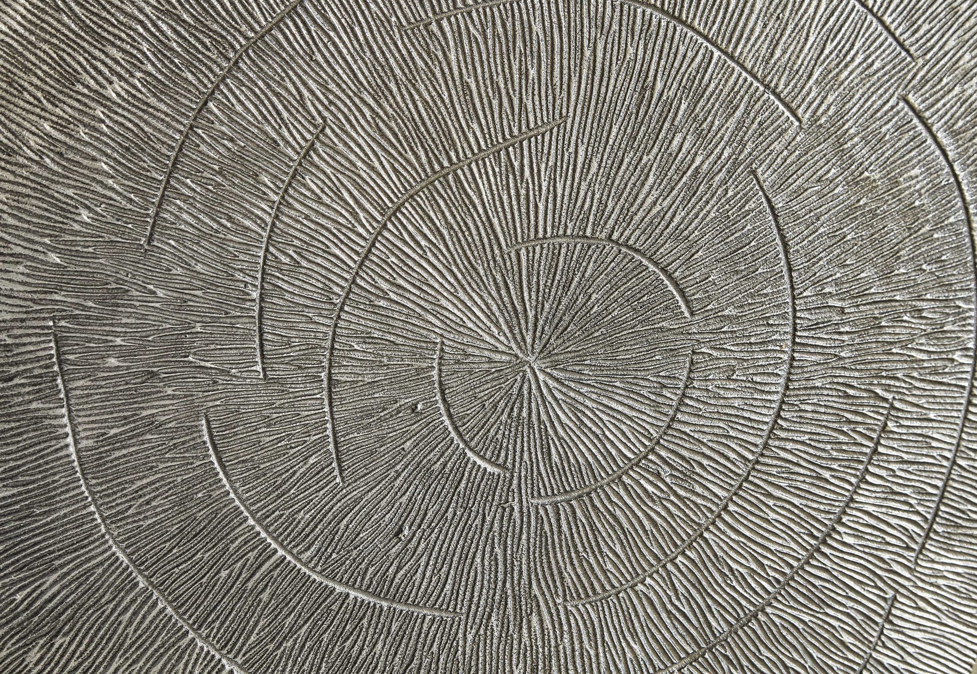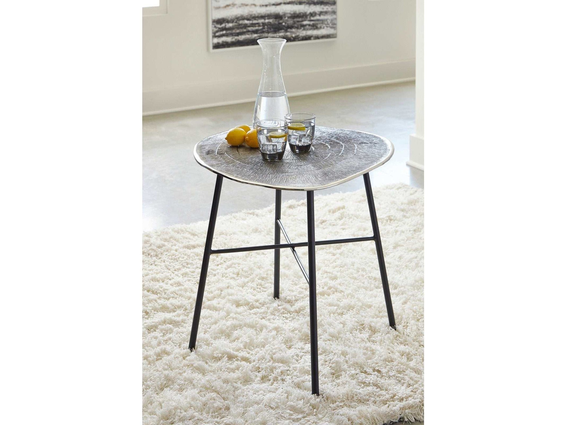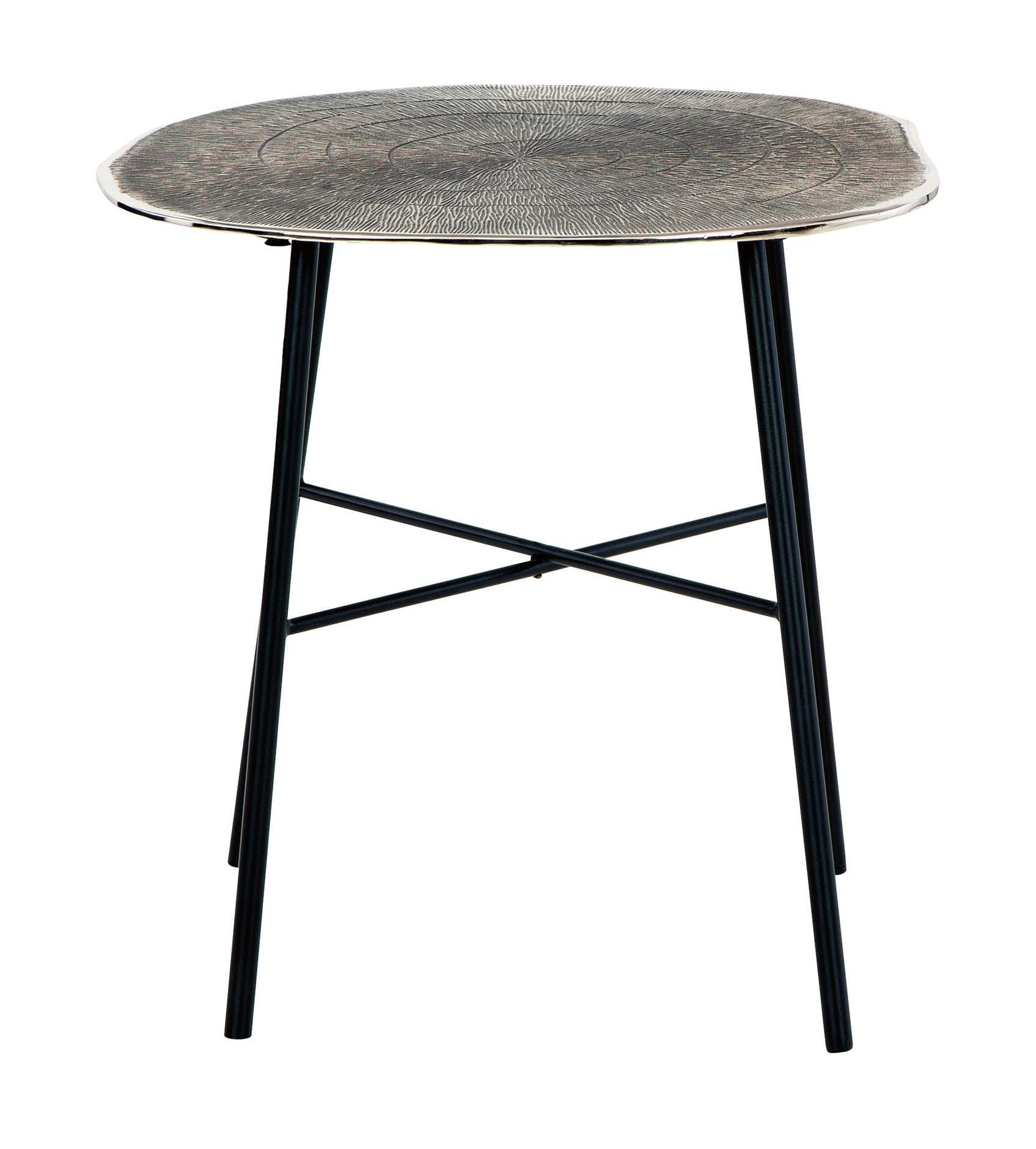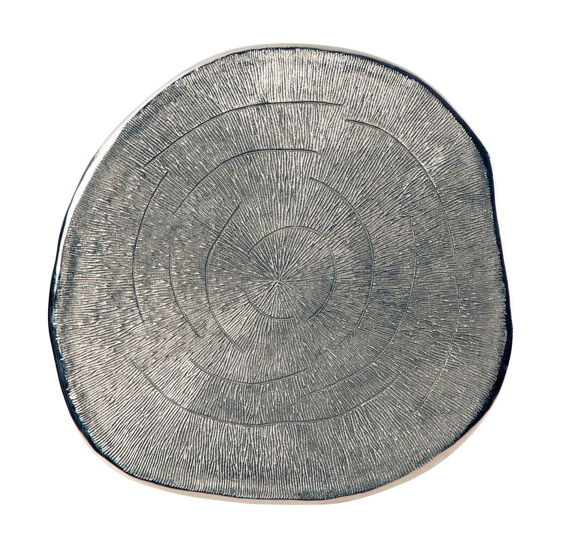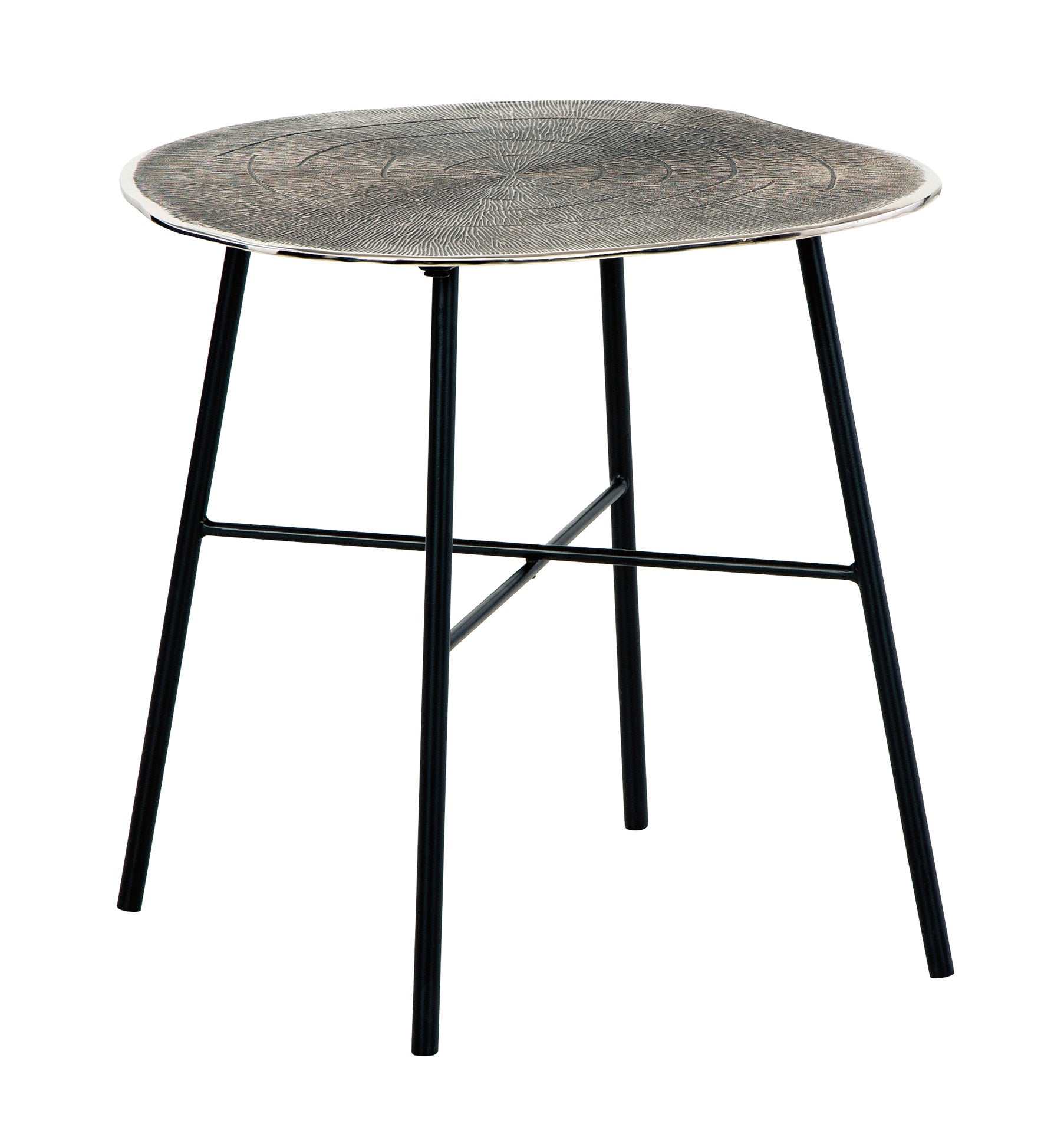 Rich with curated character, this end table puts a contemporary spin on natural beauty. Its irregularly grooved top is refined with the glamour of a gleaming chrome-tone finish. A black base completes this cool piece.