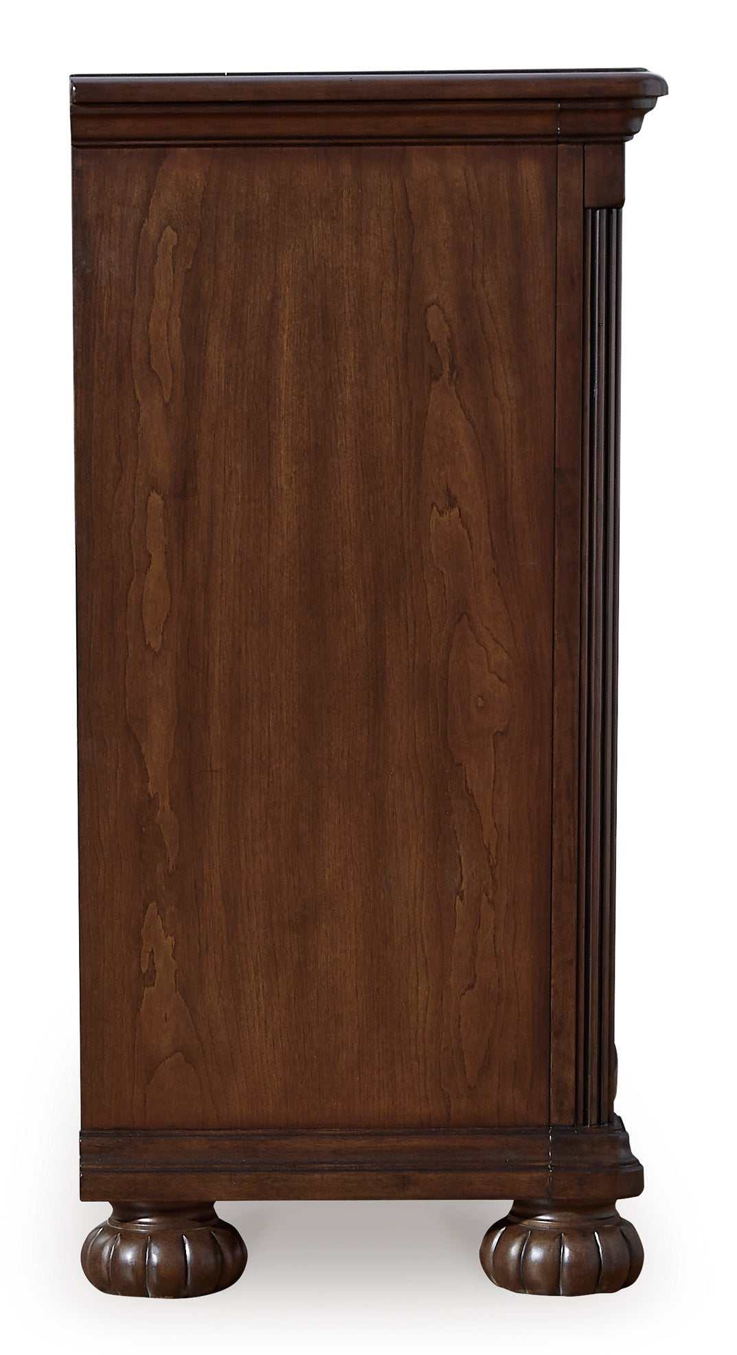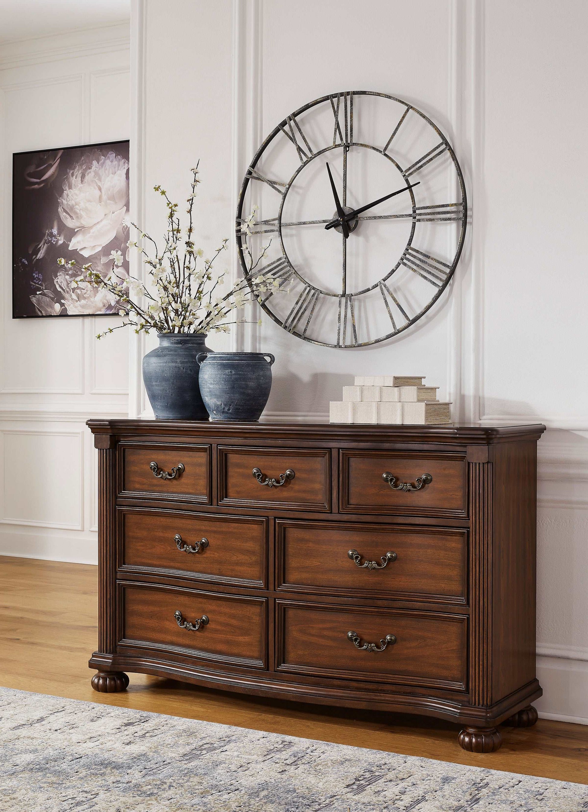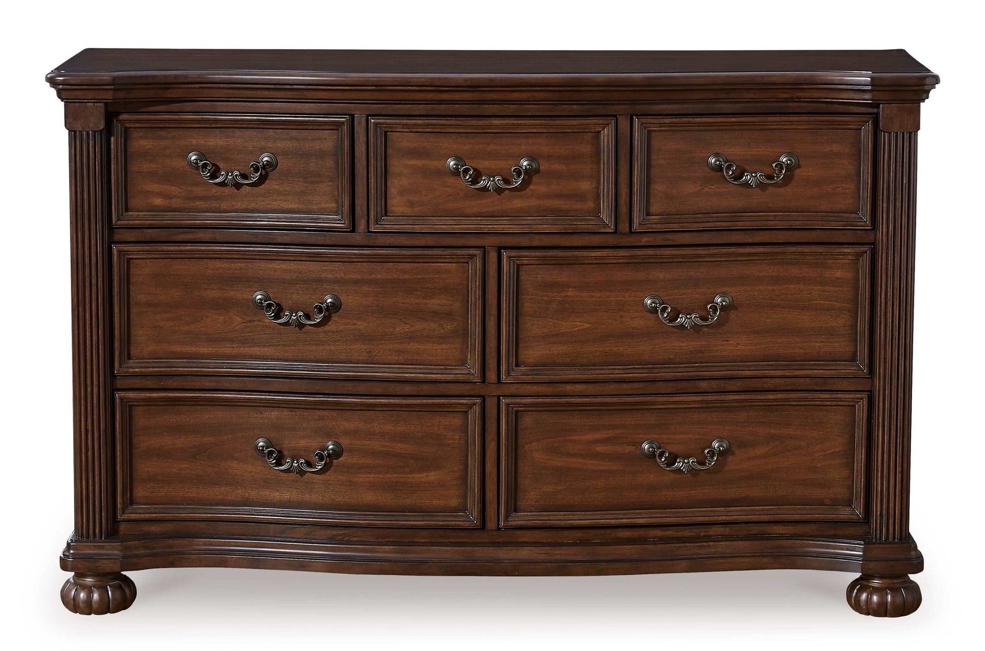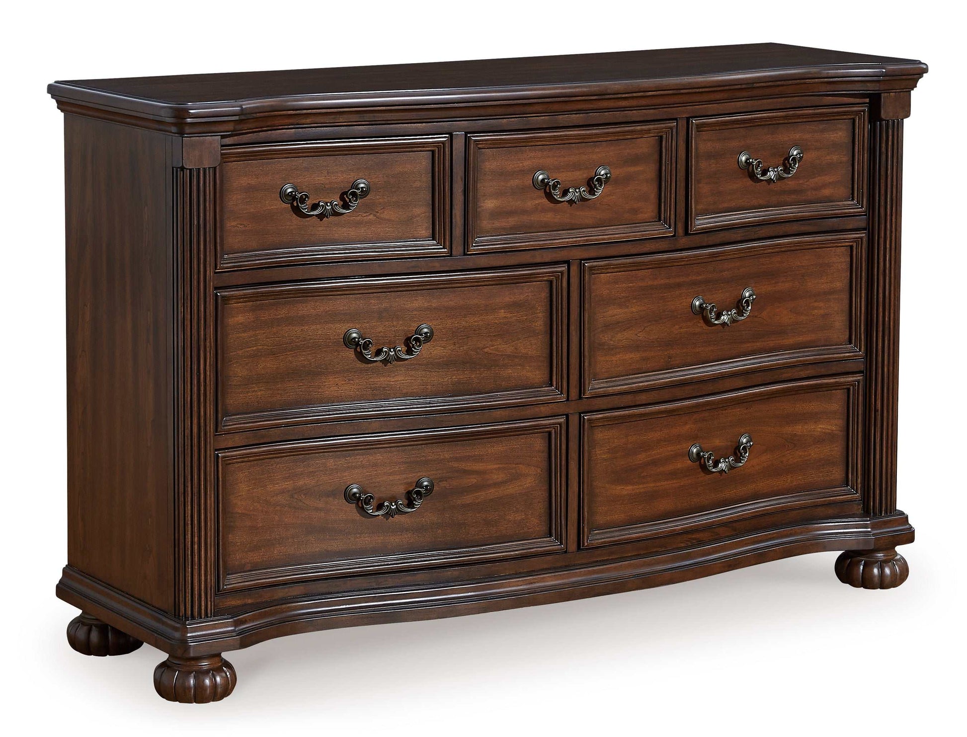 Take inspiration from the traditional luxury of this dresser. Classic with a rich cherry brown finish, its stately presence graces your room with an air of opulence. Your taste for exquisite details is satisfied with decorative drawer pulls and chic bun feet. With seven drawers acting as elegant hosts for clothes and other essentials, your restful retreat has never been so refined.