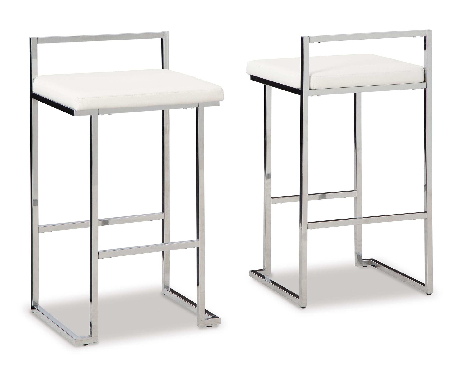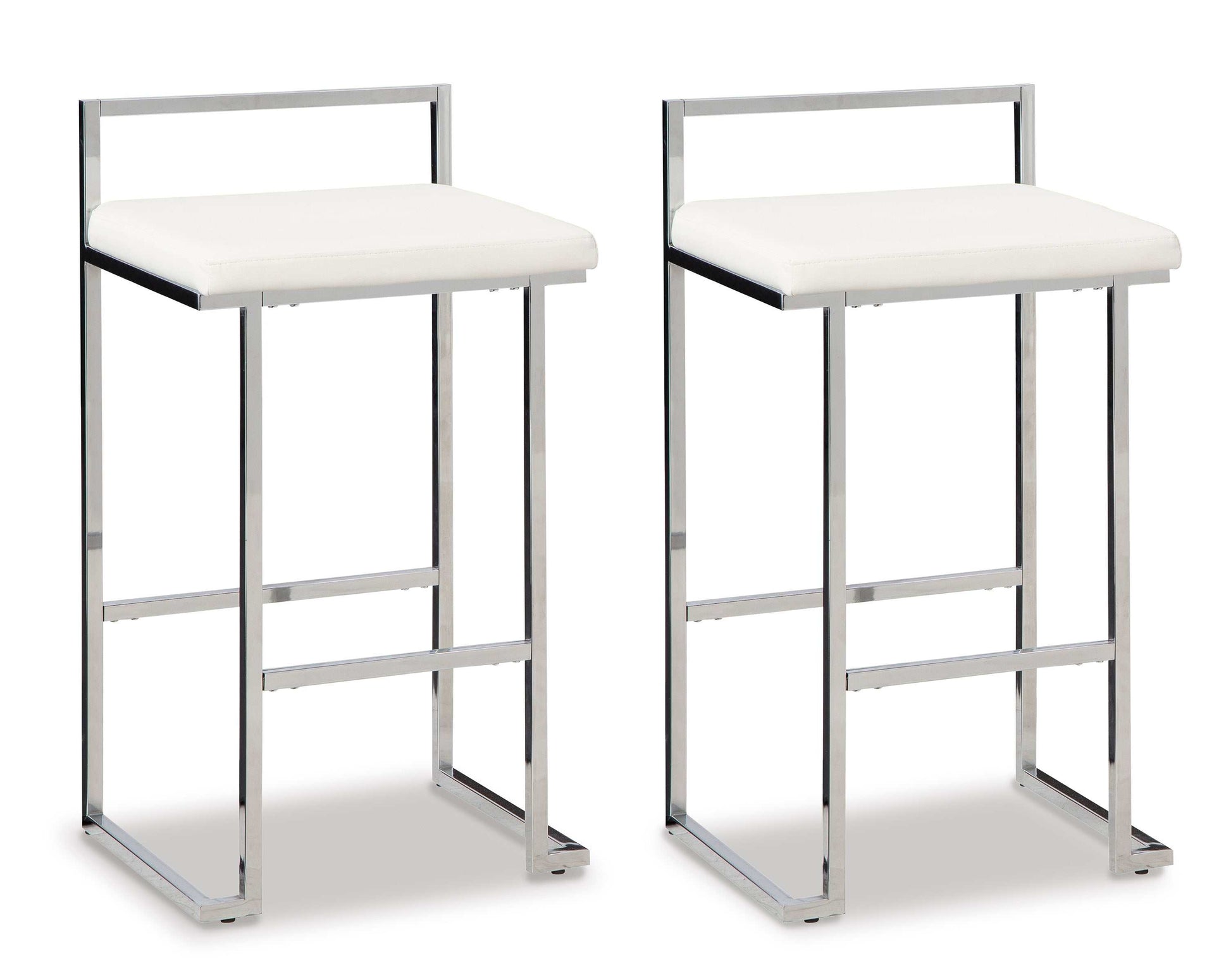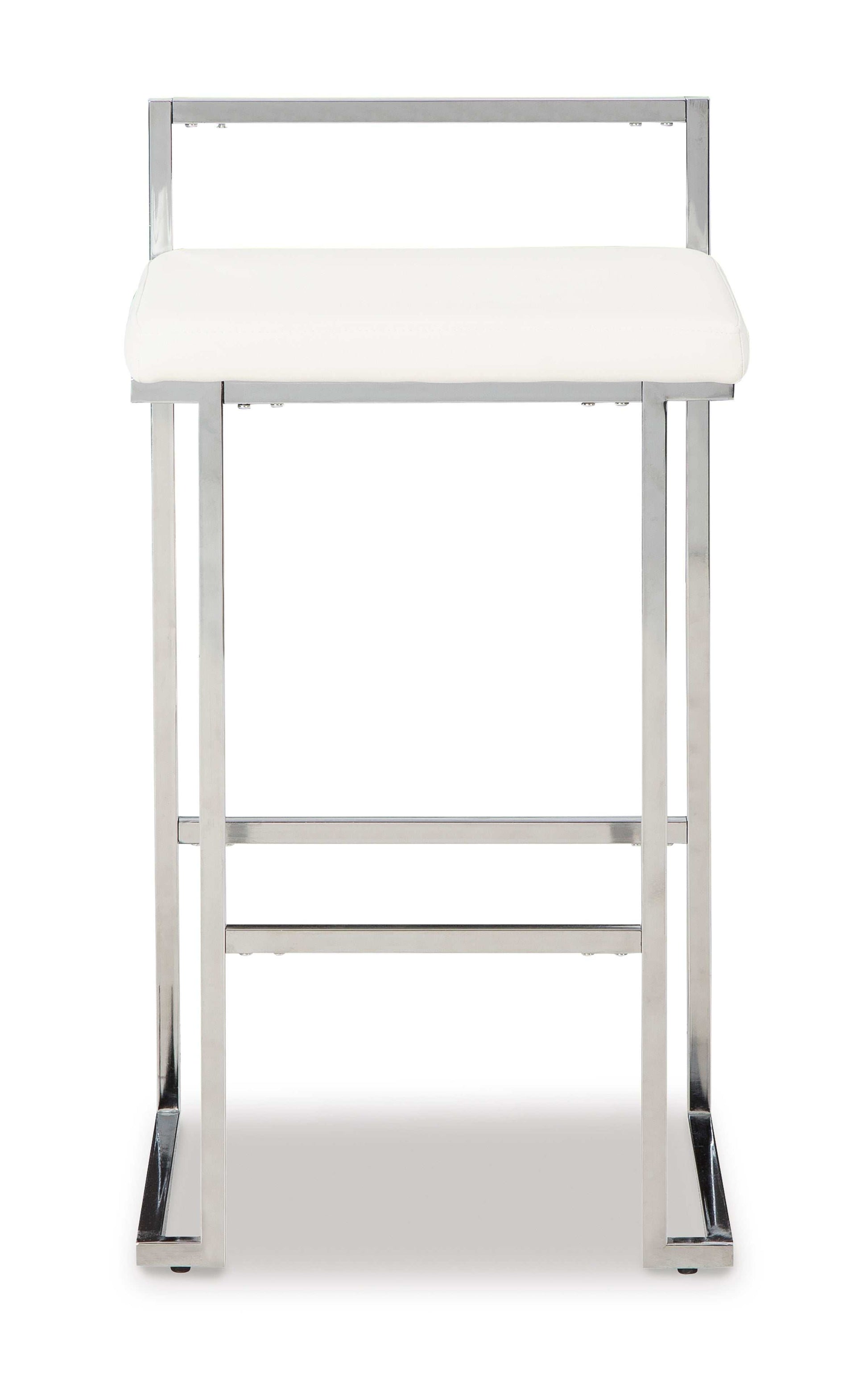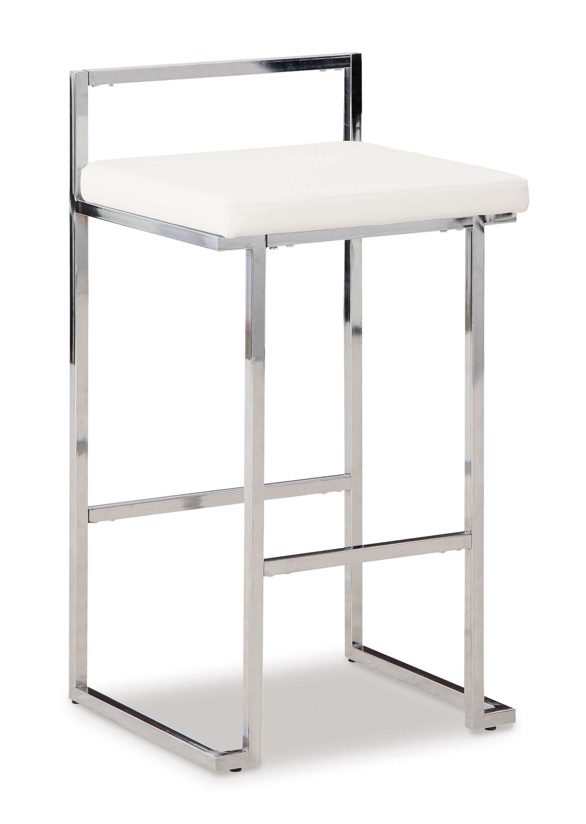 Wowing with a slim but sturdy profile and sculptural design, this bar-height bar stool is sure to whet your appetite for ultra-contemporary style. Its comfortably cushioned seat is covered in fabulous white faux leather, while the metal frame’s chrome-tone finish provides visual contrast.