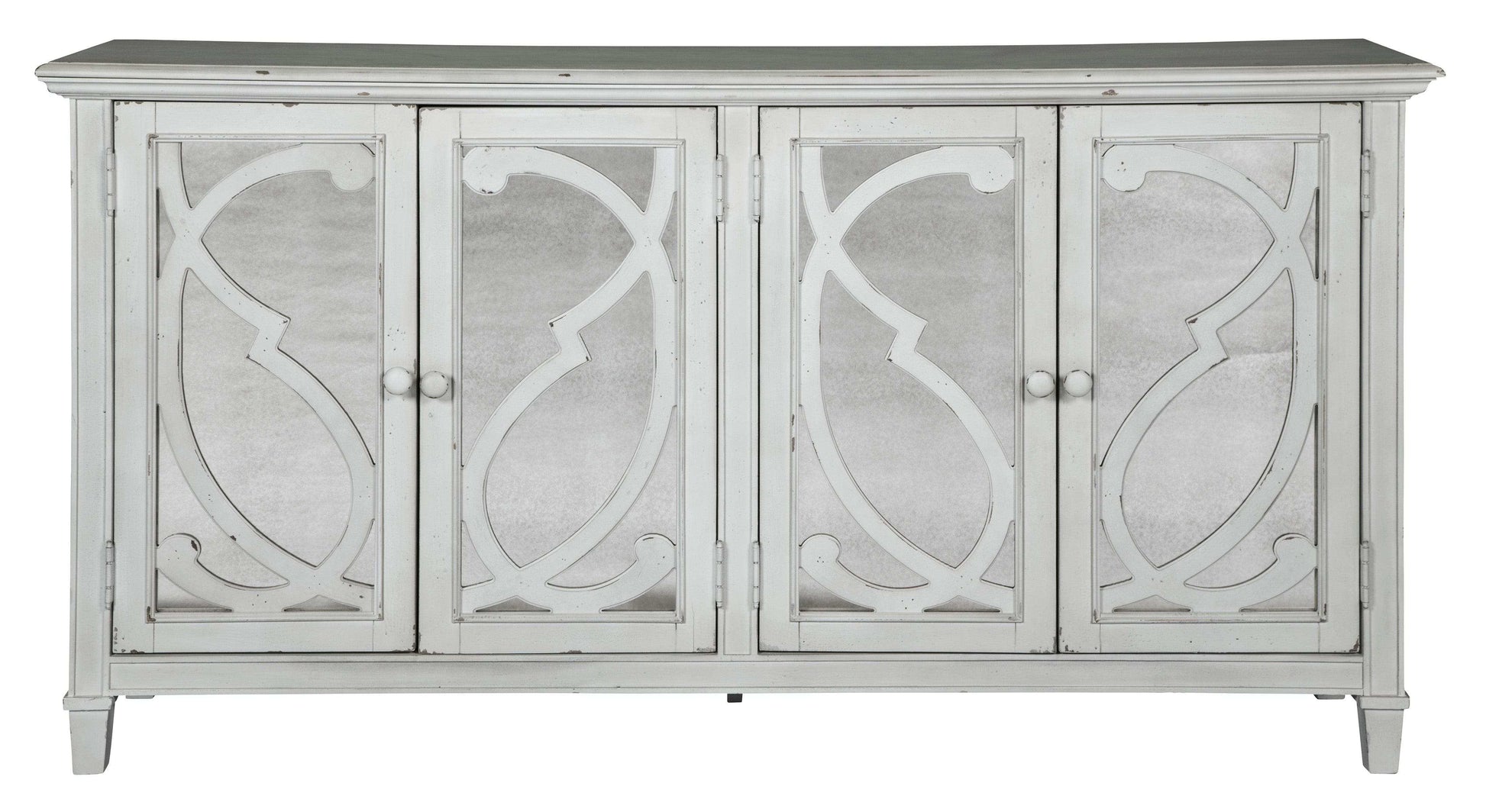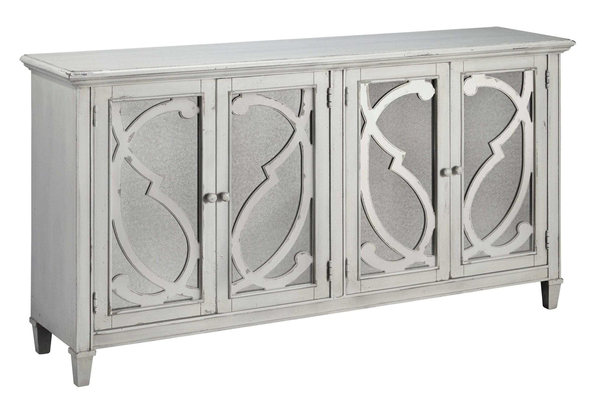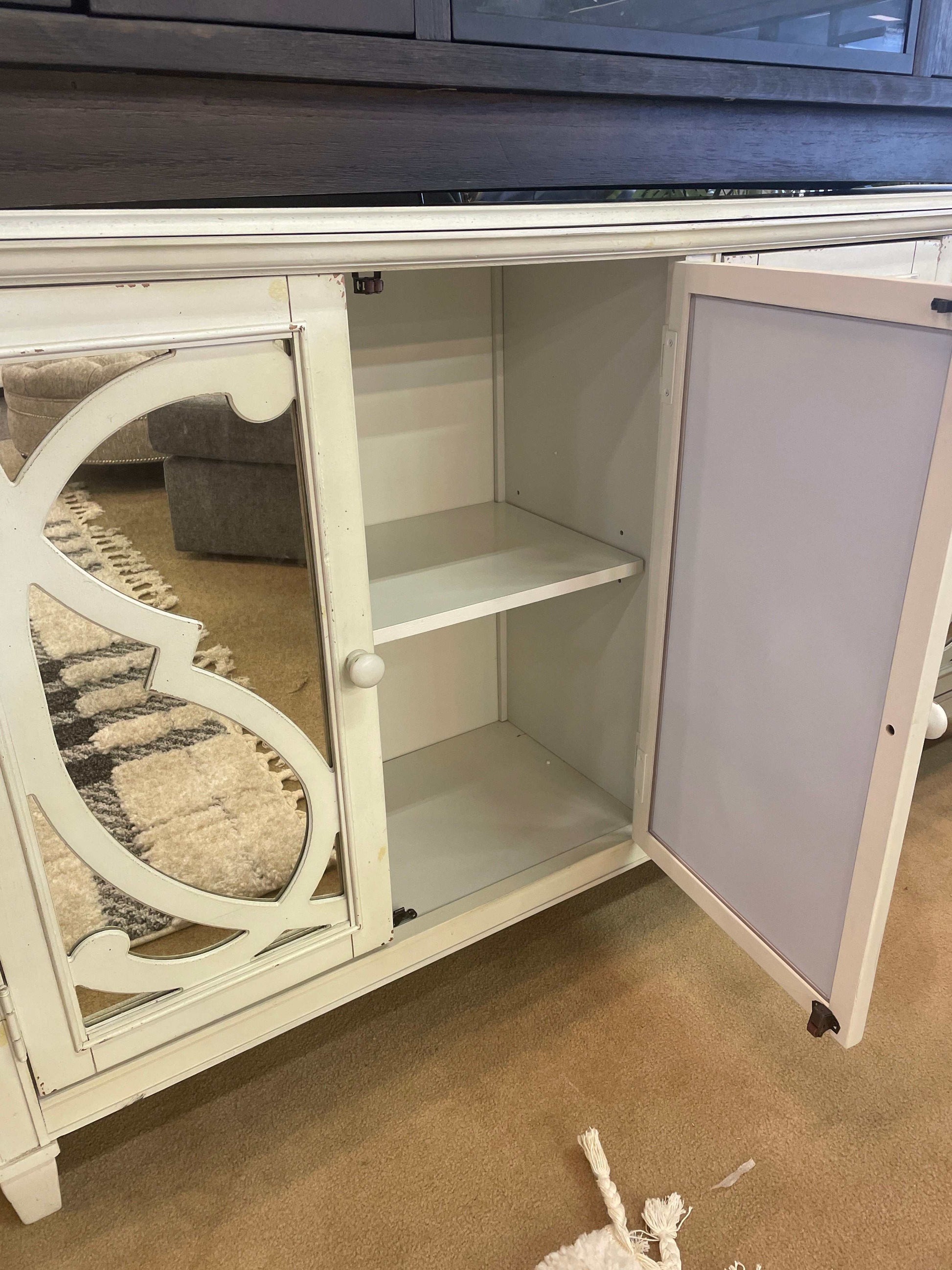 With its distressed finish made to look like fabulously faded antique white paint, this cabinet is an eclectic piece that beautifully suits so many spaces, including the dining room, living room, and entryway. Ornately scrolled filigree front doors with mirrored glass inlays are a reflection of your fine taste and stylish flair. Adjustable shelving enhances its form and function.