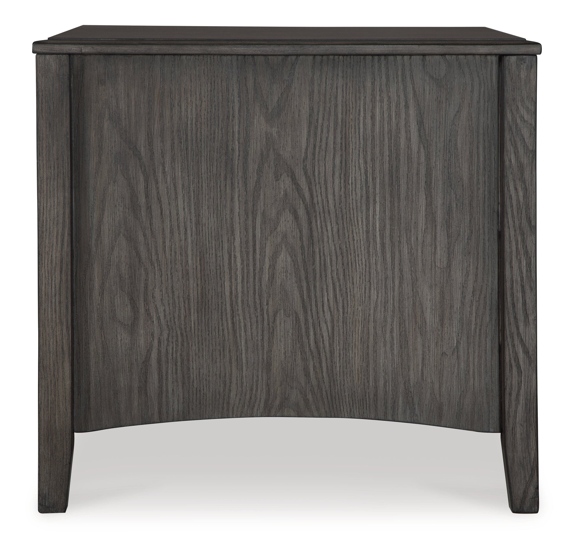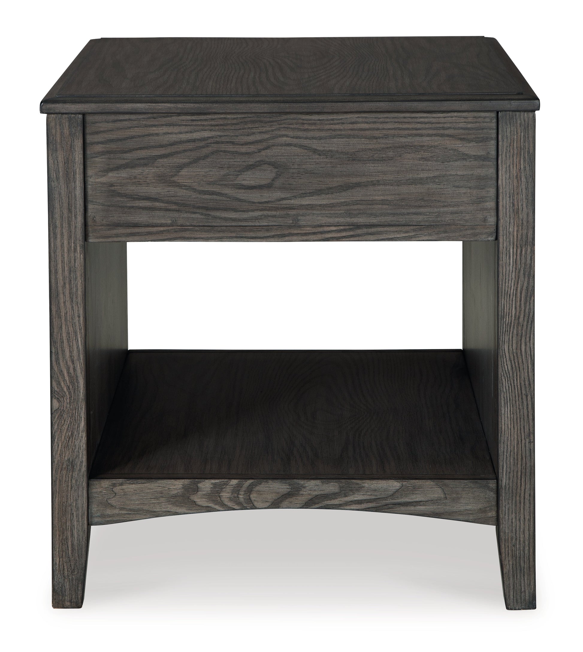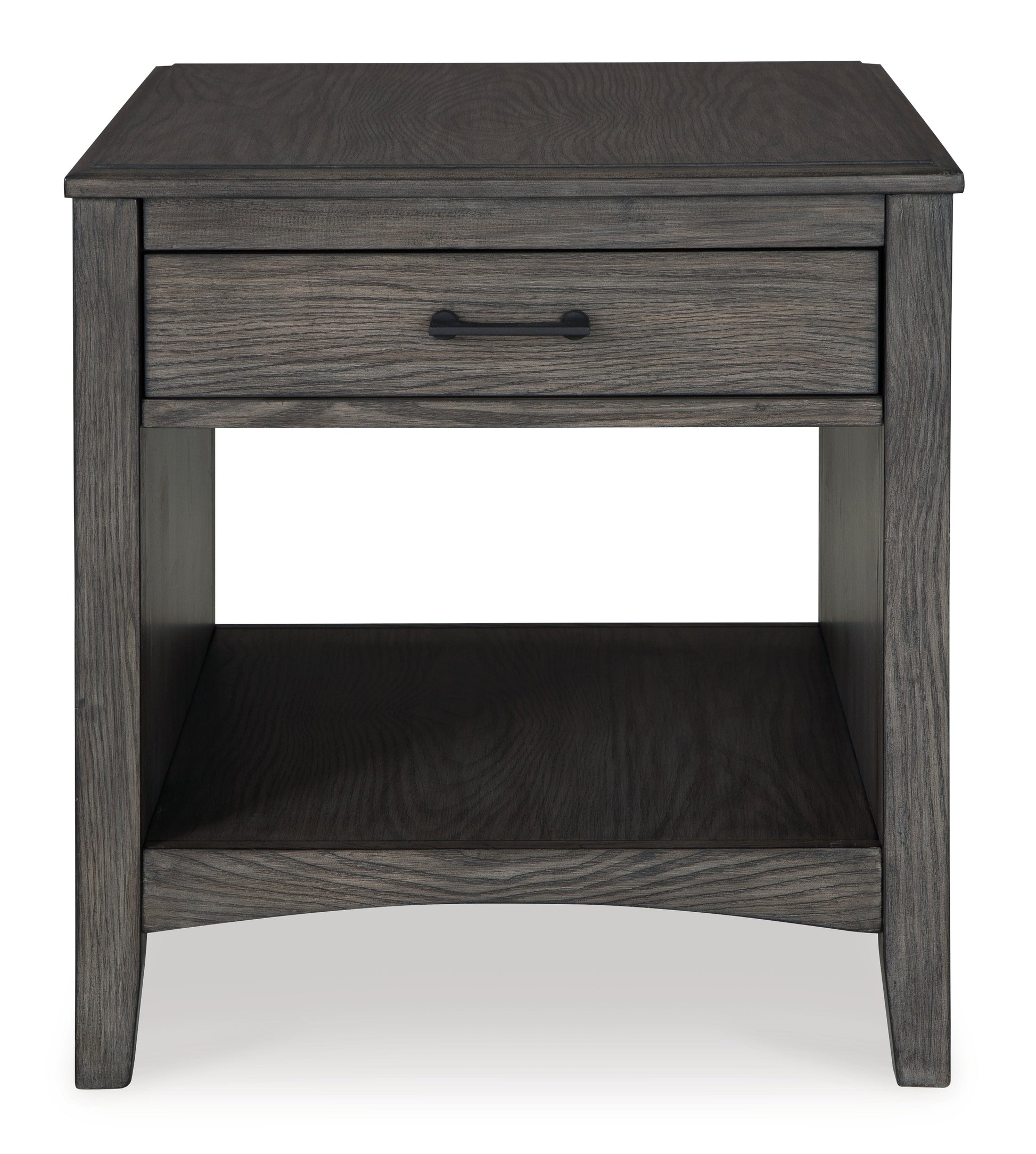 Cool and clean, yet warm and inviting. This end table has so many standout qualities, making it an inspired choice for your dream decor. A prime example of “casual contemporary” style at its very best, the designer piece is dressed to impress with its embossed wood grain texture. An open display shelf and drawer are ideal for storing smaller items like your e-reader, TV remotes and other seat-side must-haves. And the medium gray-brown finish with a blackened wood grain contrast is wonderfully easy on the eyes.