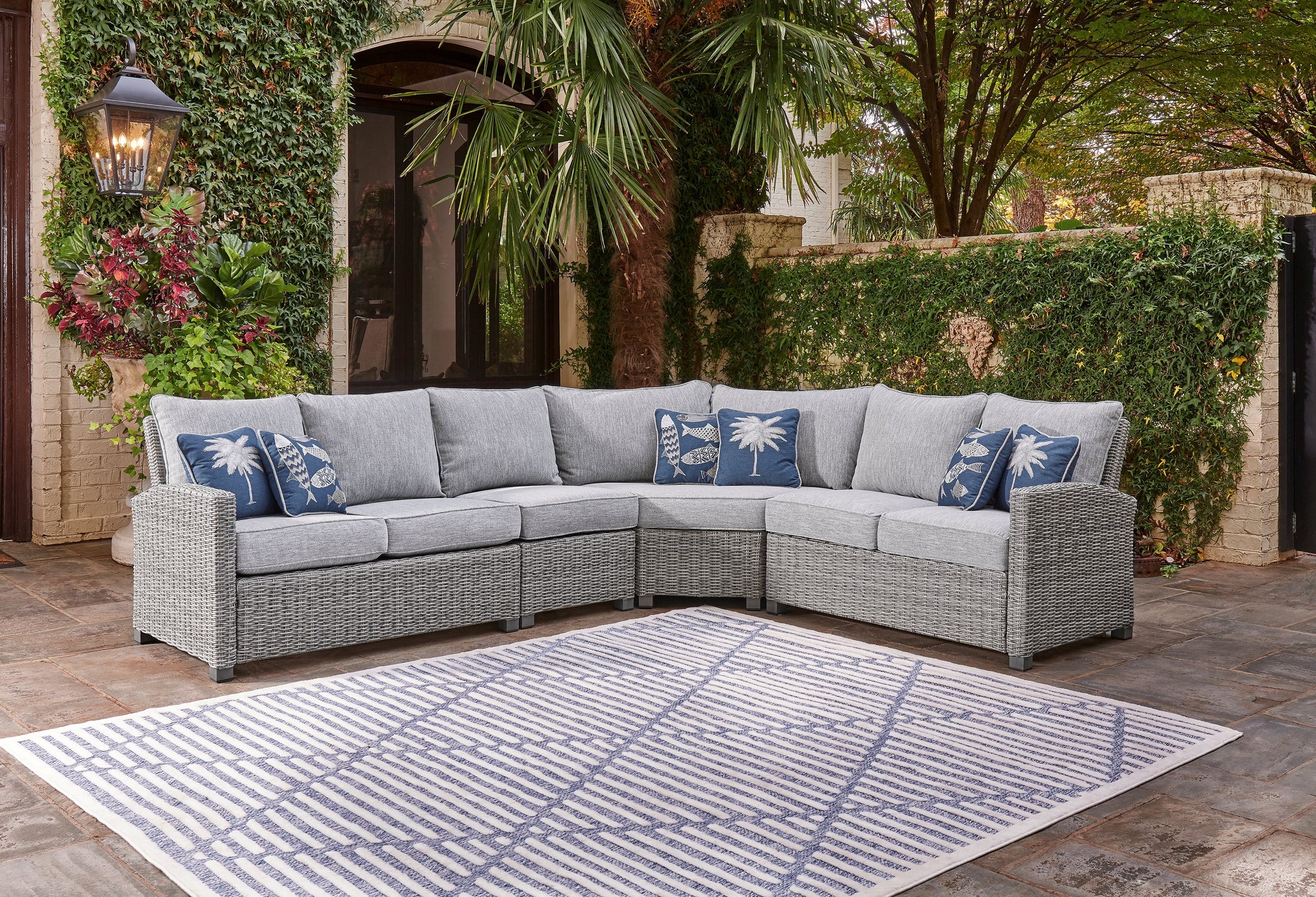 Indulge in backyard bliss. This outdoor sectional has a straightforward sense of style with its light gray resin wicker and wood-look finish. Gray high-performance Nuvella+™ fabric covers the seat and back cushions, weathering the elements and keeping your aesthetic casually cool.