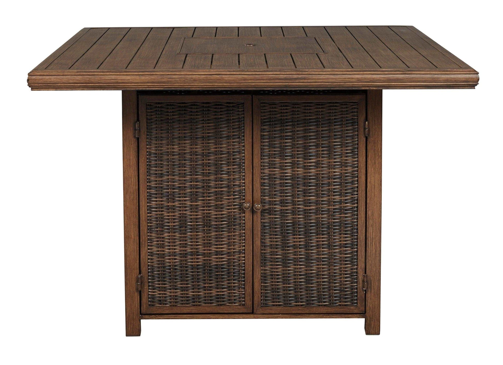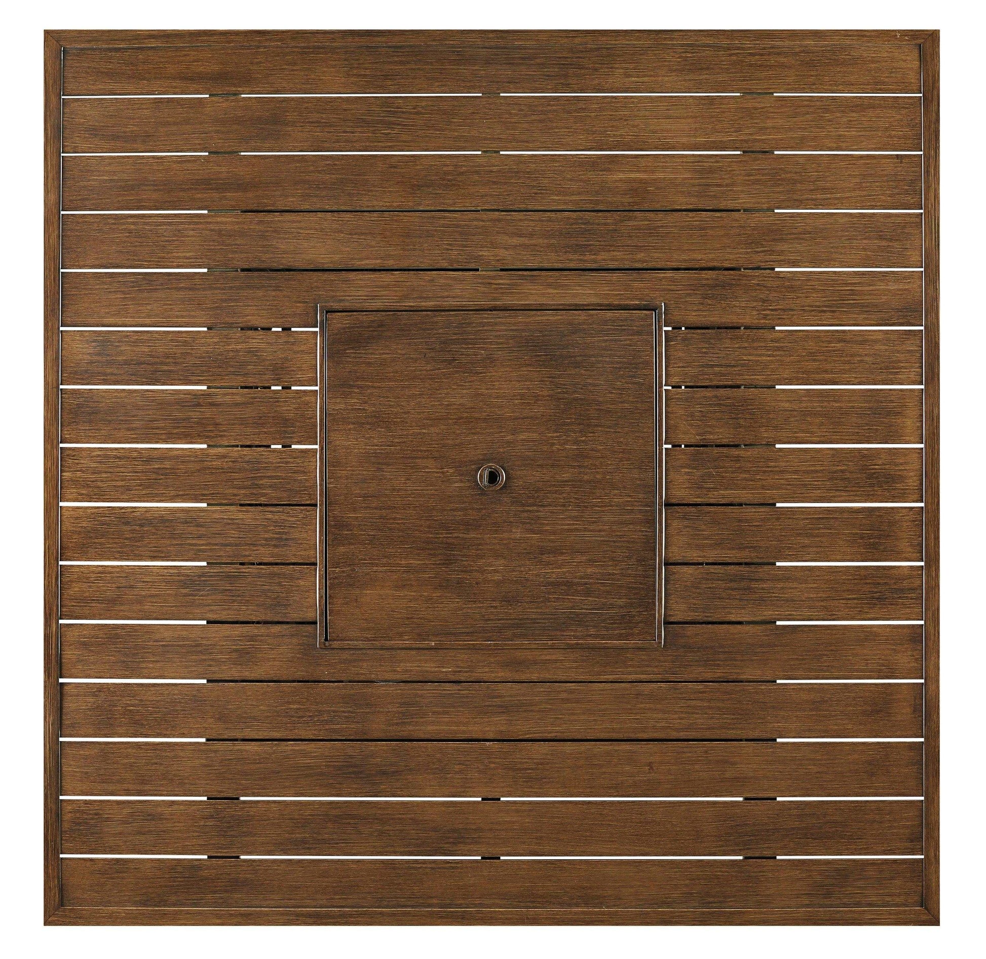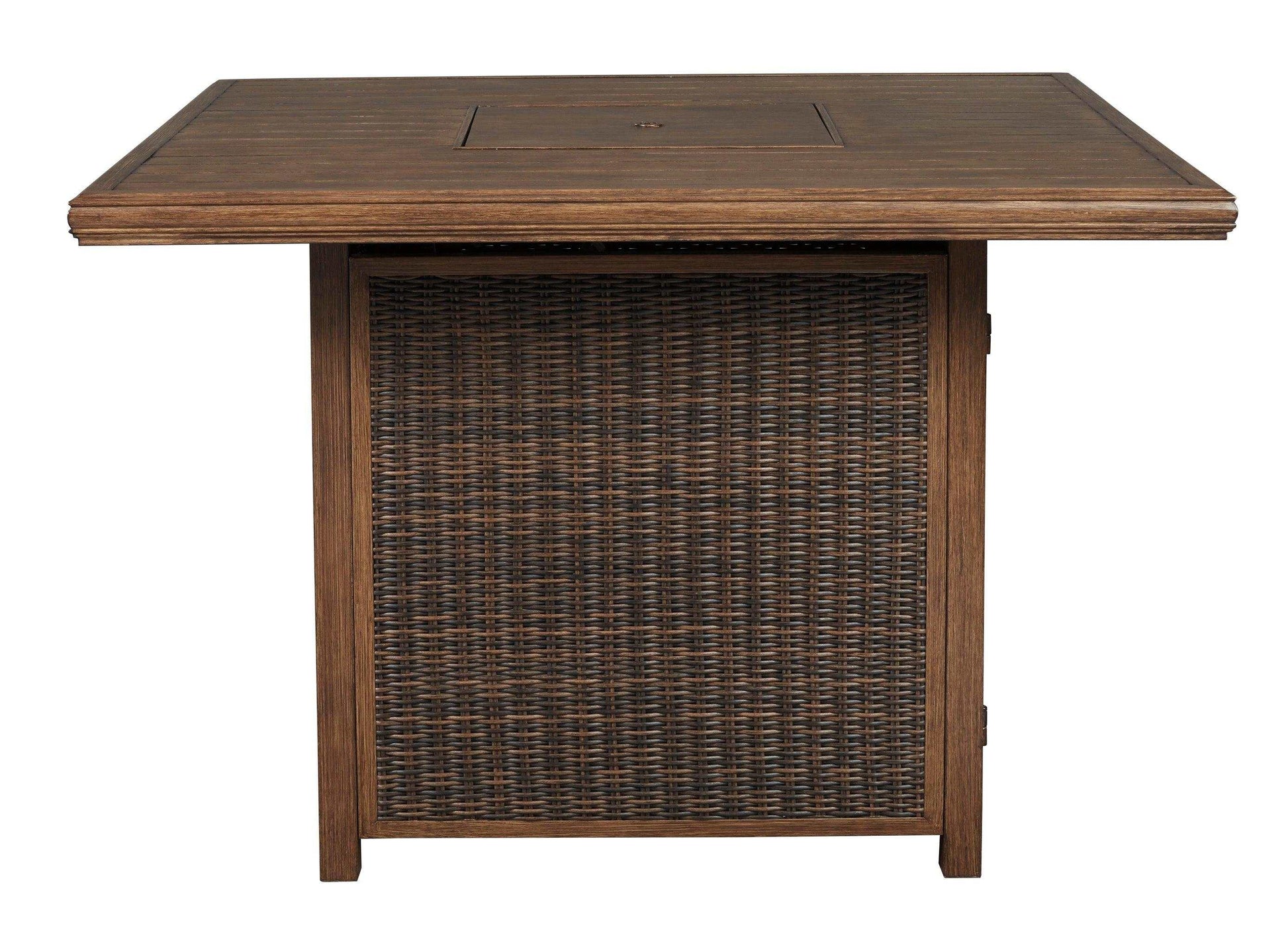 - Fire pit table with a rust-proof aluminum frame, wood-look tabletop, and side panels accented with all-weather, hand-woven resin wicker