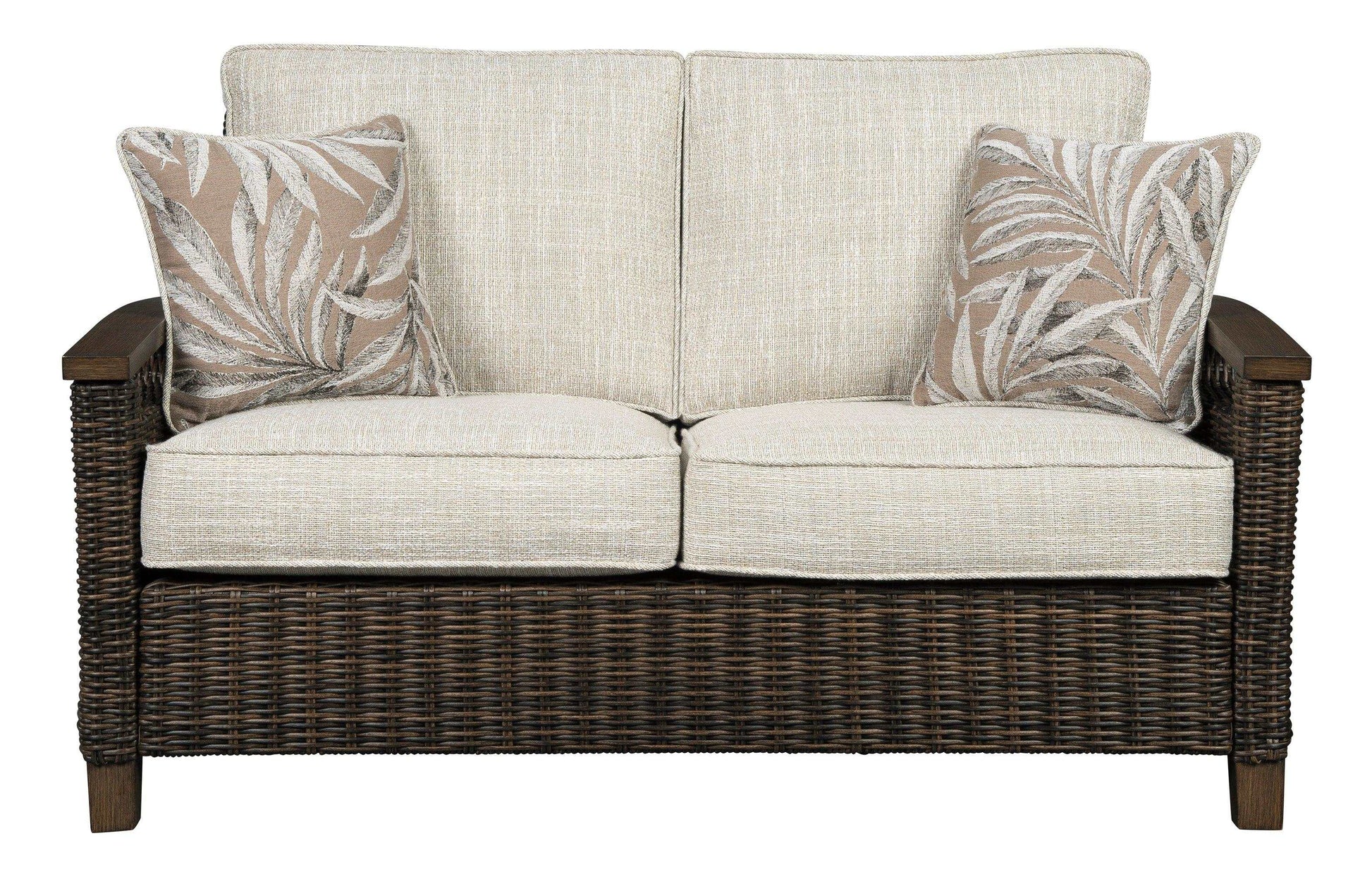 Pretty enough for trendy interiors, yet durable enough to weather the elements, this outdoor set rises to the challenge beautifully. Handwoven resin wicker over rust-proof aluminum merges high style with low maintenance. Rest assured, though the exposed armrests and feet look remarkably like wood, their sturdy aluminum construction is perfectly suited for al fresco living. Plush seat cushions and throw pillows wrapped in high-performing Nuvella® fabric aim to please.