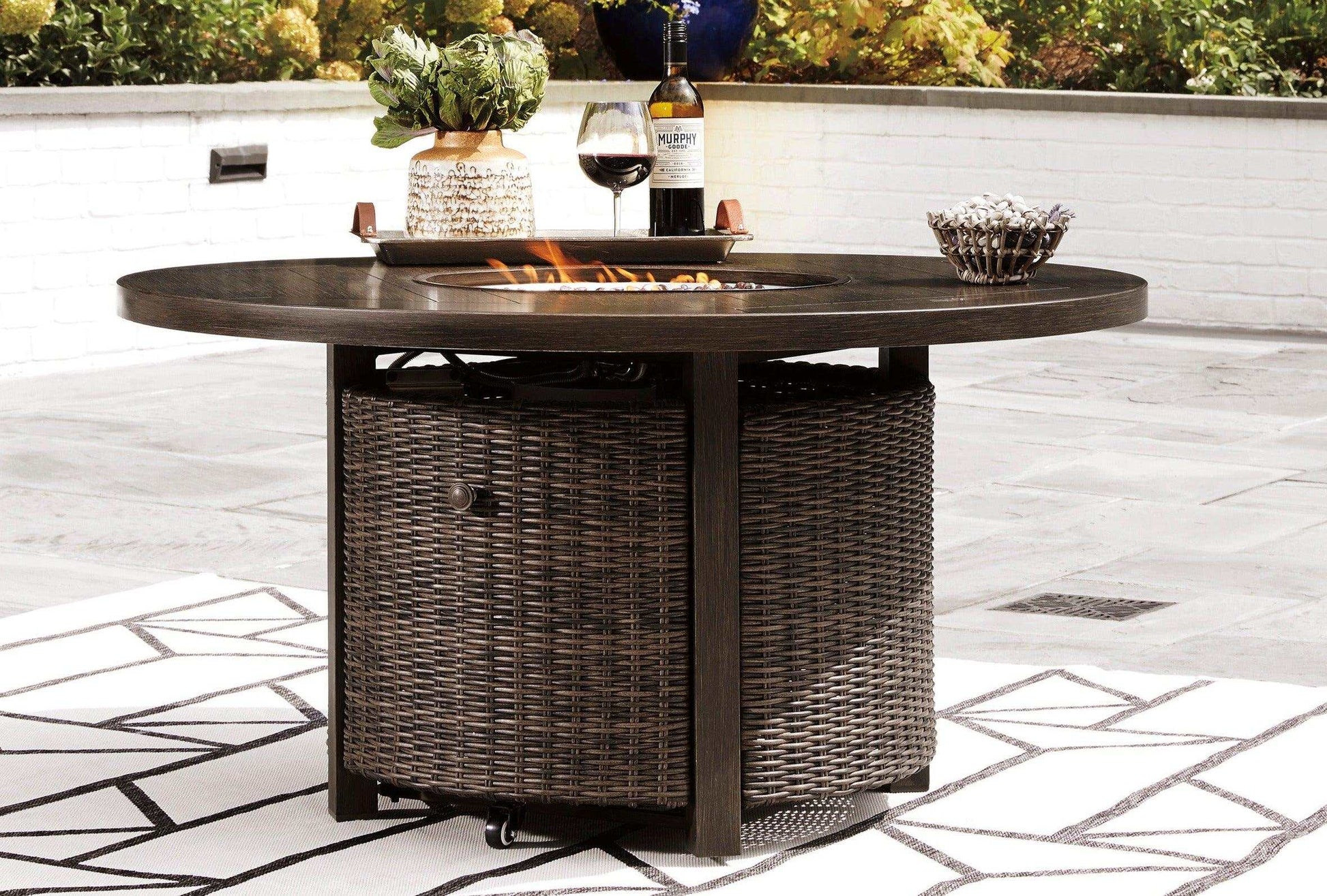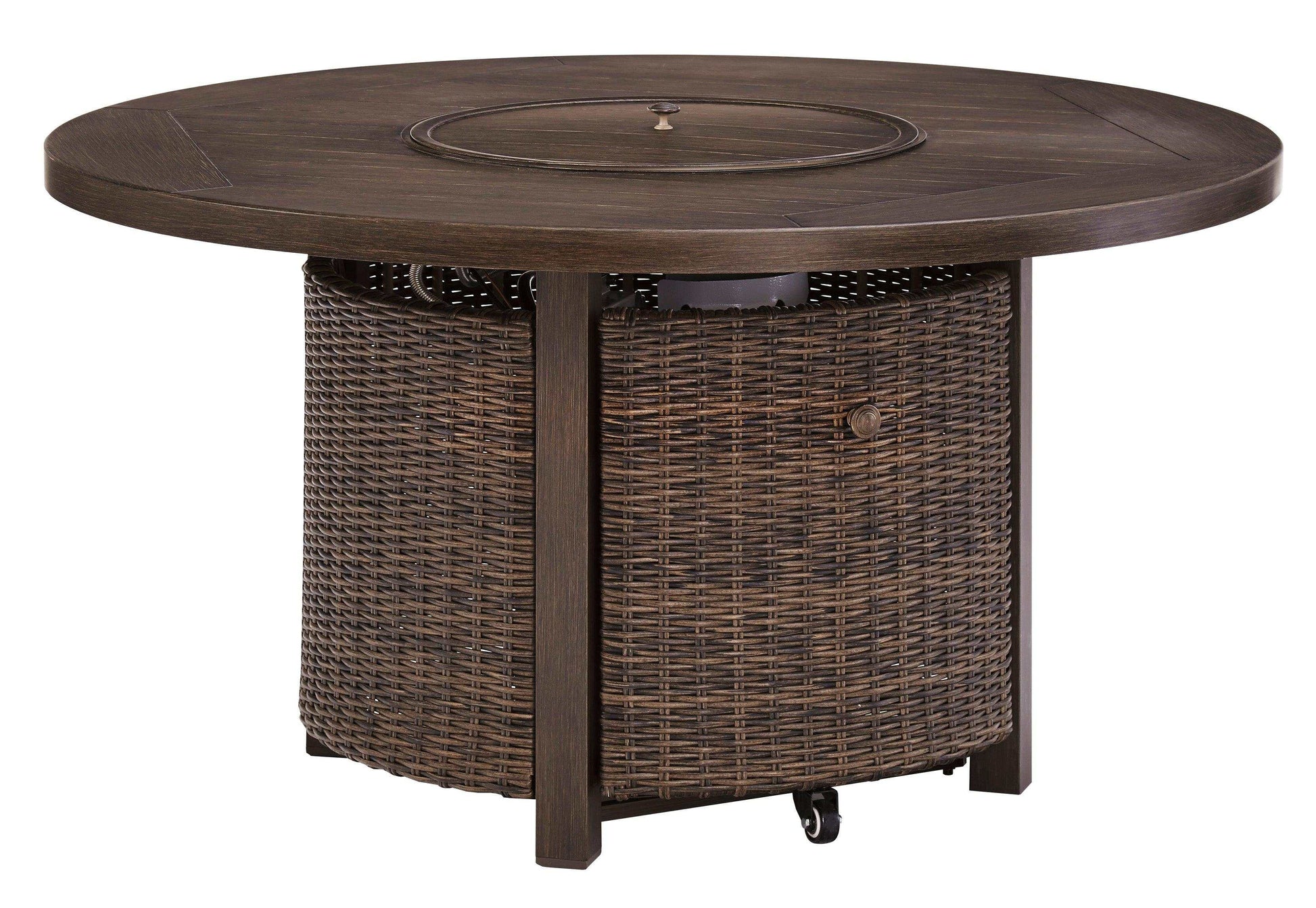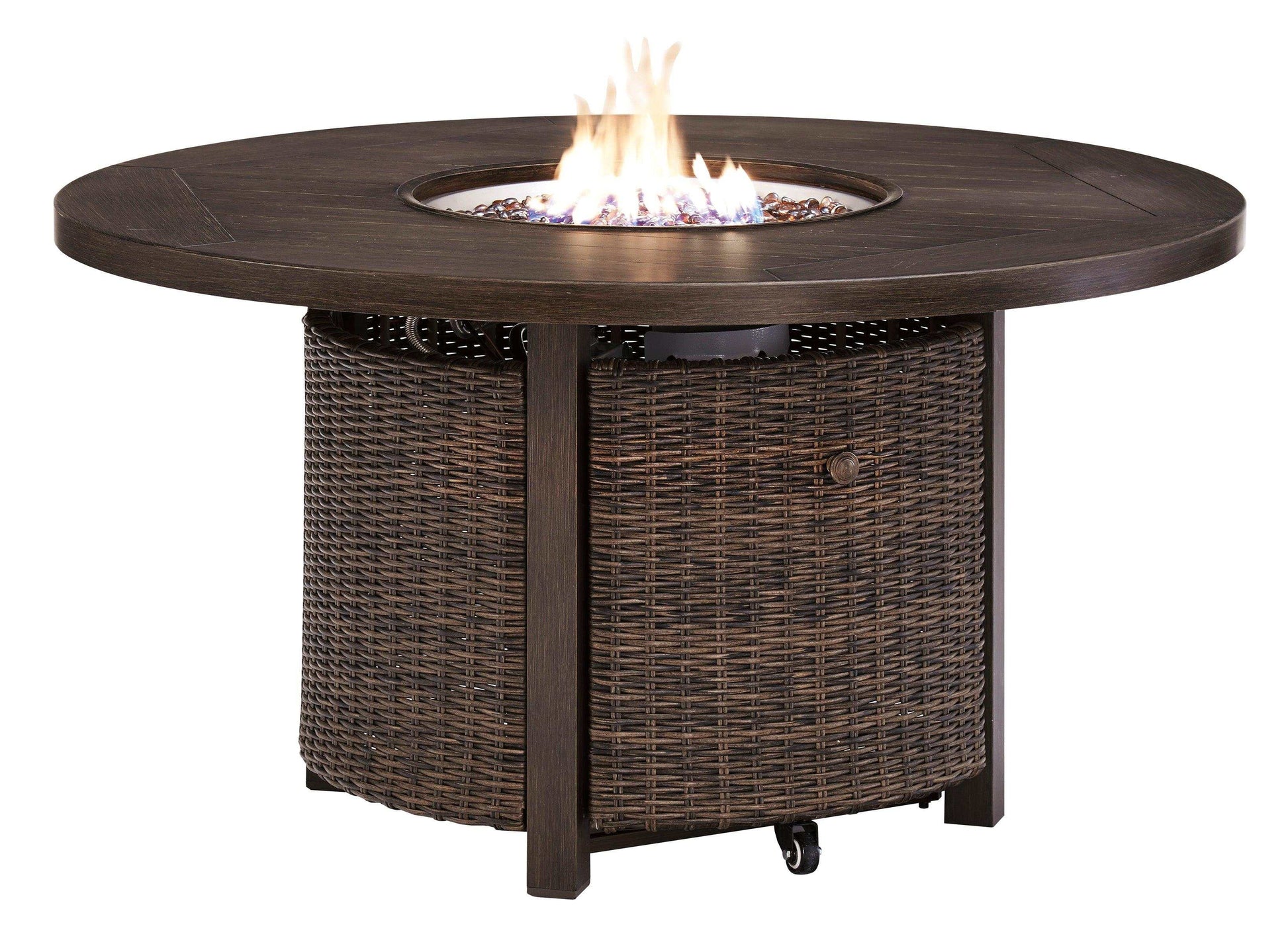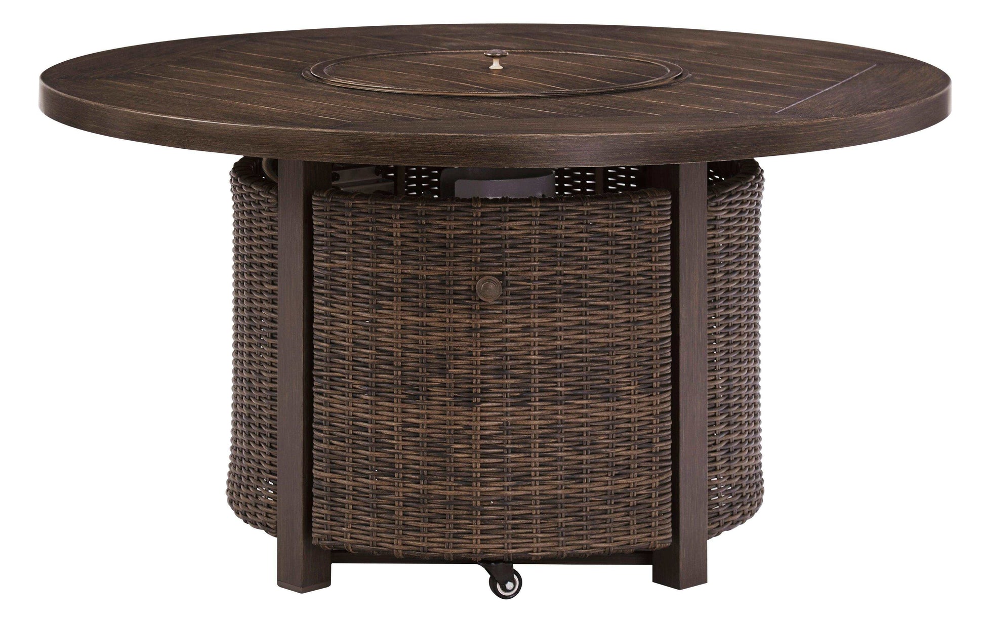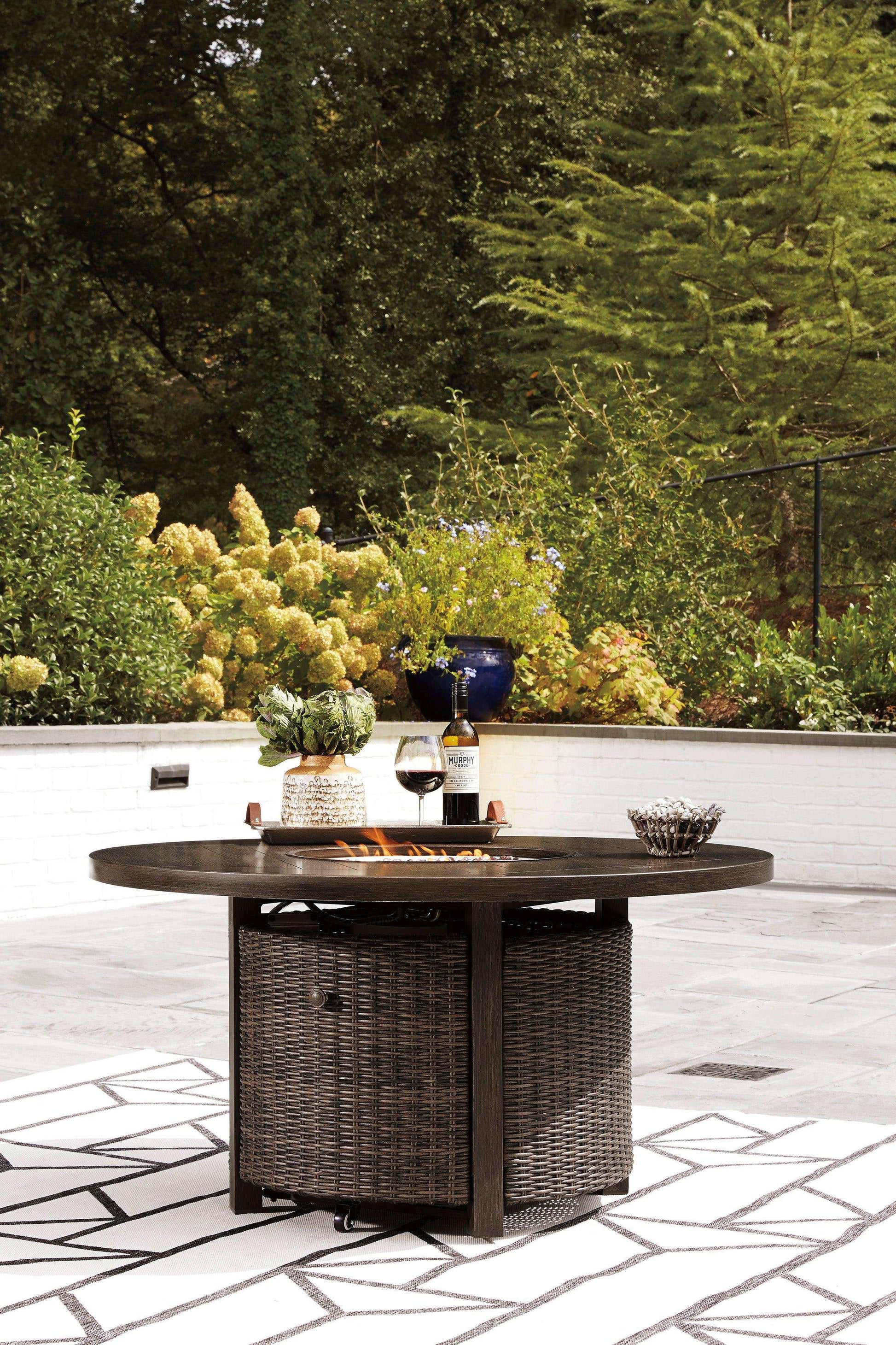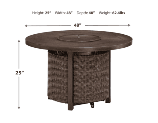 Turn your backyard space into your own piece of paradise with this outdoor fire pit table. Though this outdoor table looks remarkably like wood, it’s made of sturdy, rust-proof aluminum that’s perfectly suited for al fresco living. Enhancing the rustically refined aesthetic: side panels accented with all-weather, handwoven resin wicker. The result may look high maintenance, but rest assured, this outdoor piece is anything but. With the press of a button, ignite a flickering flame that dances over a bed of glass beads. And with room for four, it’s one highly accommodating outdoor fire pit table.