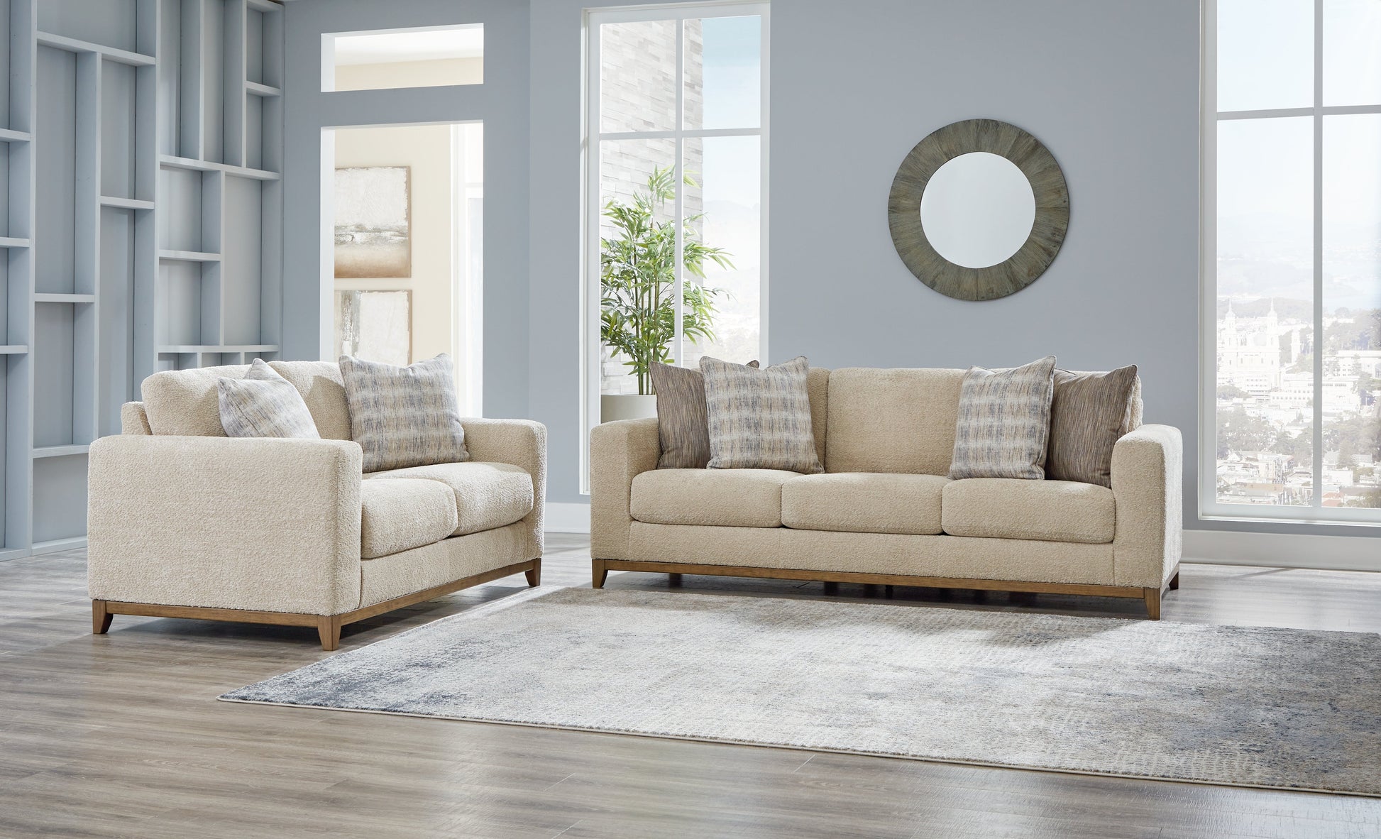 Serene style with a modern sensibility. Delight in the cozy, versatile embrace of the Parklynn seating package. It takes an on-trend approach to irresistible texture and natural beauty, showcasing soft neutral upholstery accented with a transitional wood trim. As refined as it is laid back, this set also keeps comfort a priority with plush, thick seat cushions.