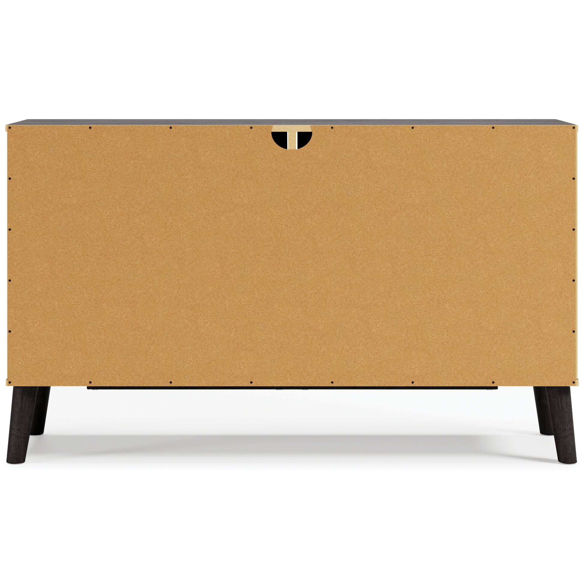 The perfect marriage of simple and contemporary style, this dresser is a charming addition to your home. It features an expressive two-tone look, with a dark charcoal finish over replicated oak grain with an authentic touch and a replicated sugarberry wood grain. Ball-bearing glides offer smooth opening and closing of the drawers, while matte black knobs and splay legs add a finishing touch.