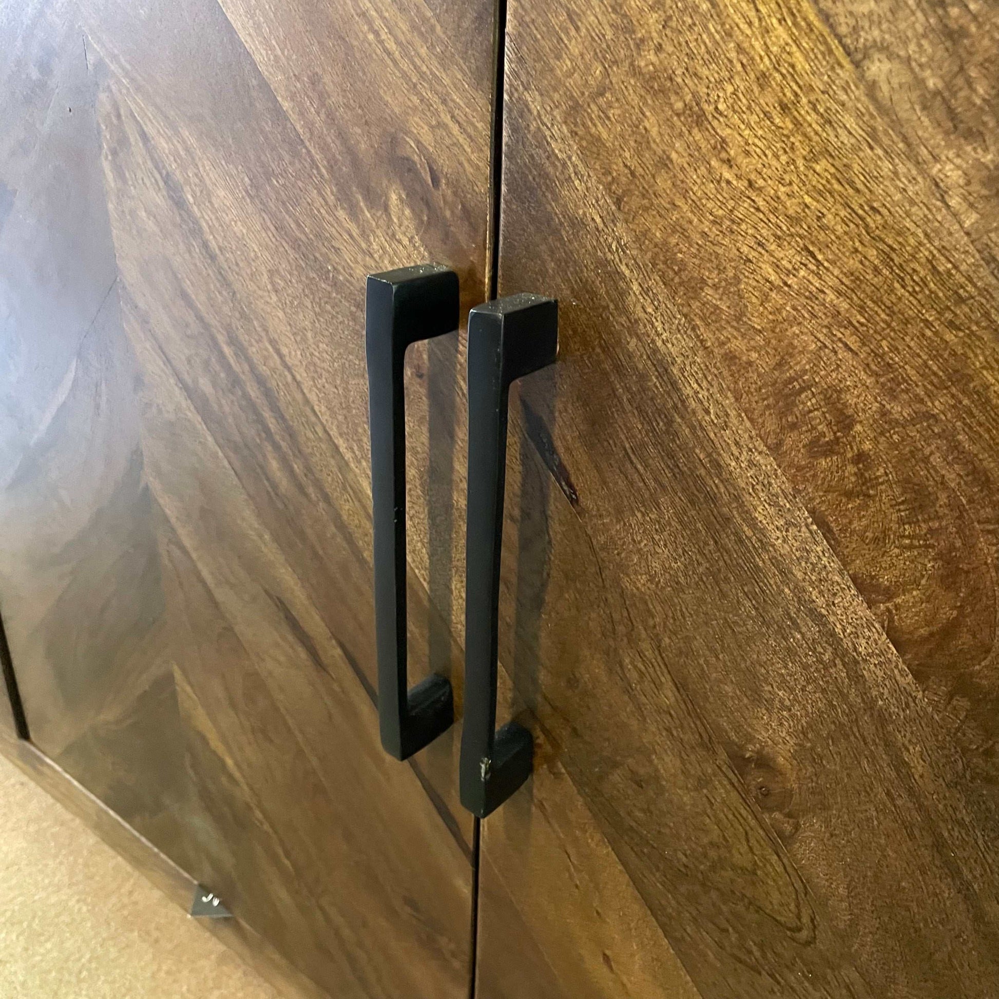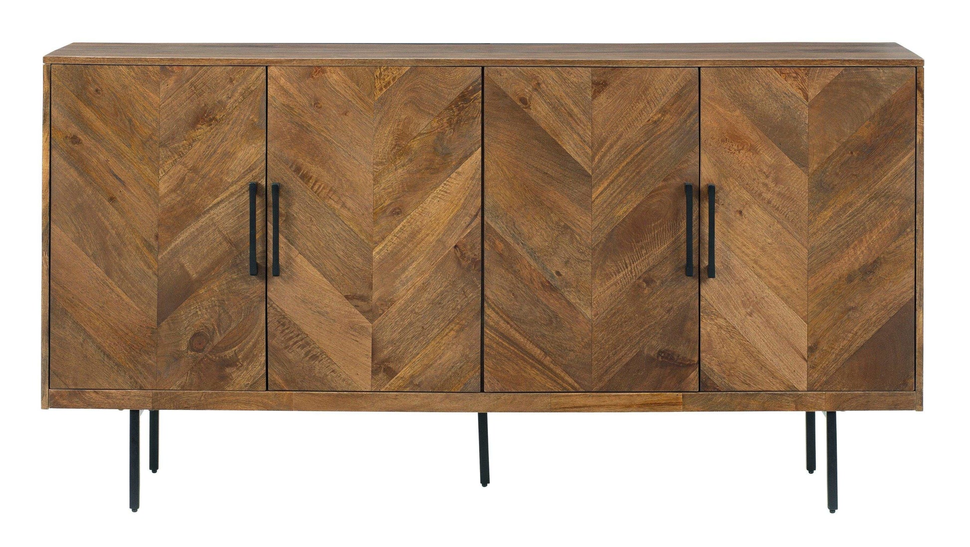 Storage options abound with this accent cabinet featuring 4 chevron pattern doors accented by long dark gray finished metal door pulls. Store dinnerware, cookbooks and many other options within the sideboard which features 2 fixed shelves. The light brown finish will complement virtually any room decor.