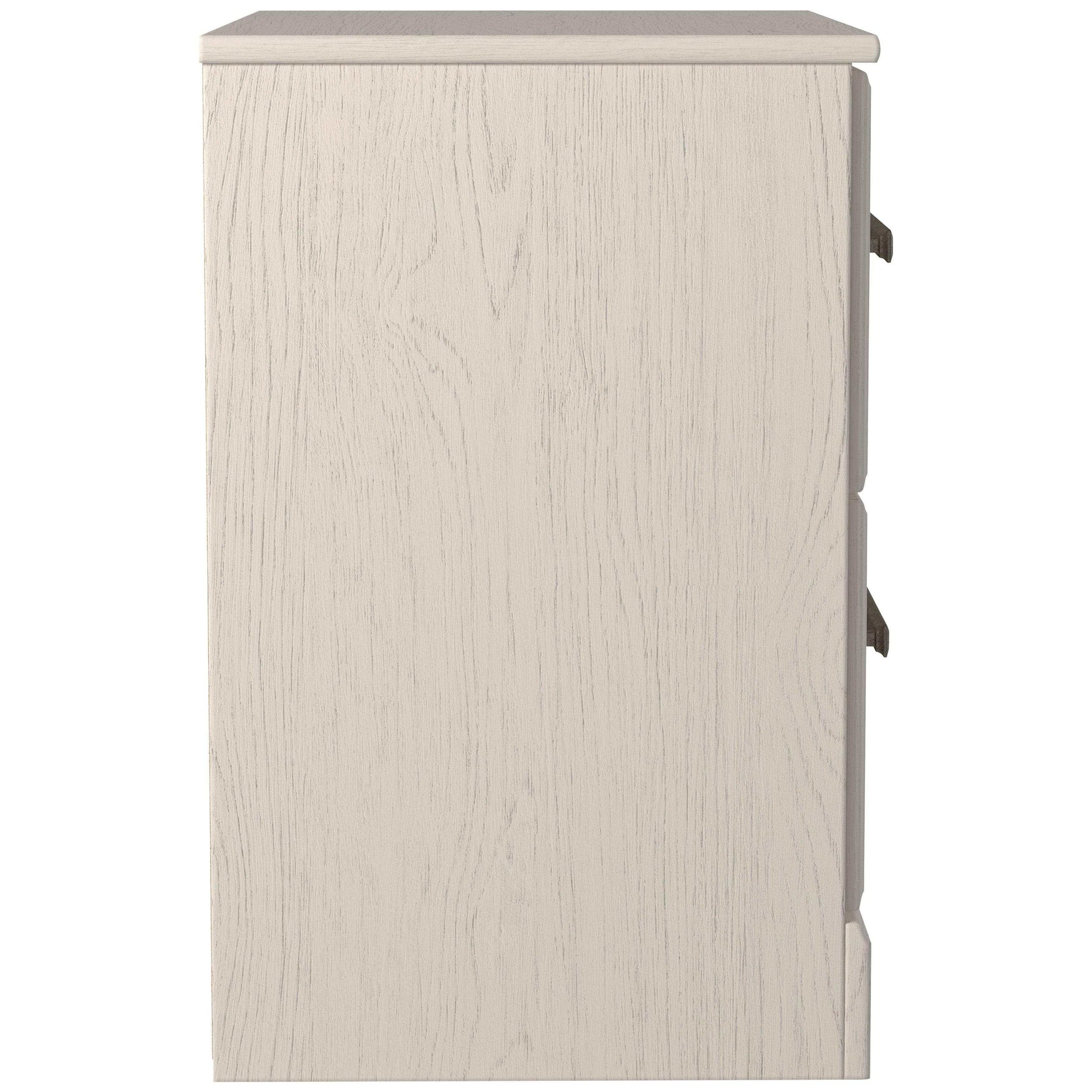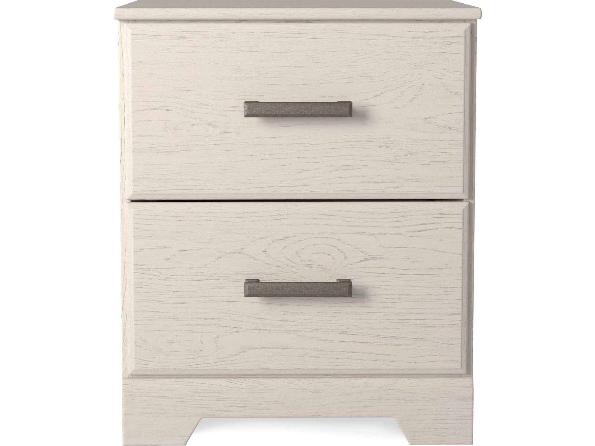 With its clean-lined look and modern attitude, this nightstand is a fresh style awakening. Crisp, white hue over subtle replicated wood grain easily complements other furniture finishes. Smooth drawer fronts with antiqued pewter-tone handles completes the aesthetic.